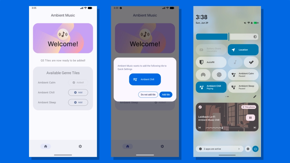 Интерфейс прост: при запуске Ambient Music предложит вынести один или несколько из трёх плейлистов в виде плитки на панель быстрых настроек. Аудиопоток кэшируется локально для воспроизведения без доступа к сети.