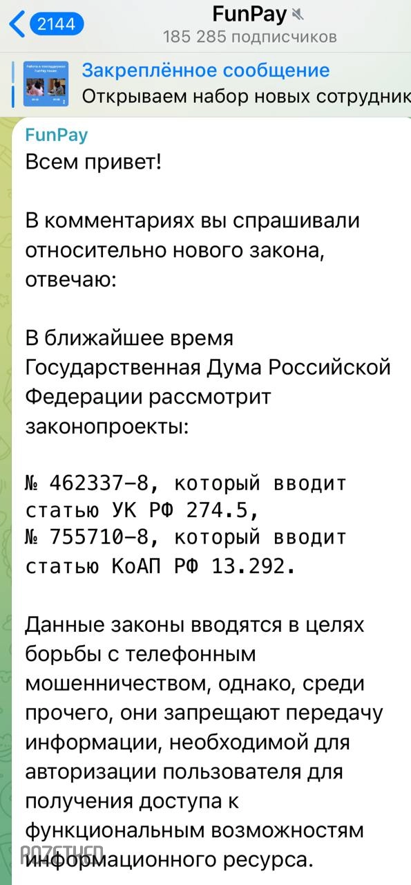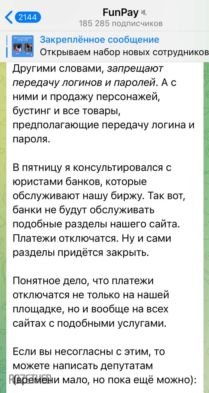 Площадка по продаже аккаунтов, персонажей и ключей к играм FunPay заявила, что в ближайшее время перестанет предоставлять услуги, связанные с передачей данных от аккаунтов другим людям. Представитель платформы указал, что это идёт вразрез со свежими поправками Госдумы в последний законопроект.
