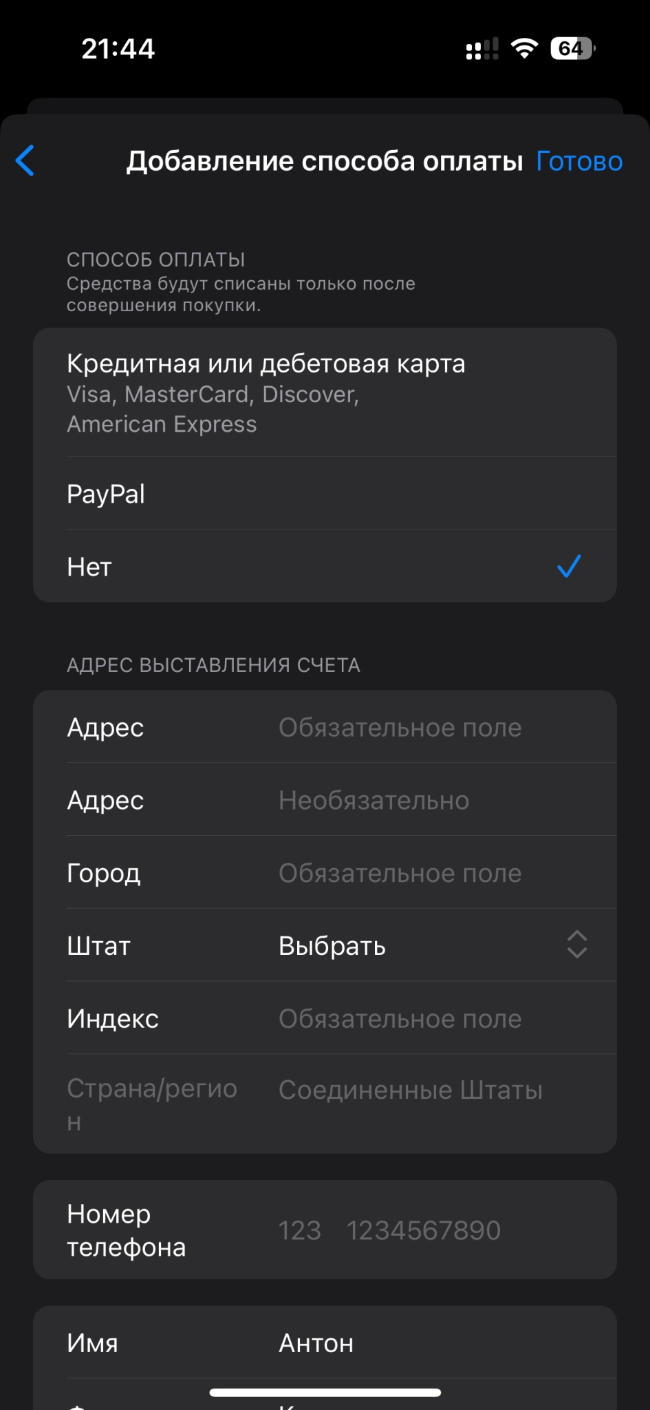 - Заполнить необходимые поля вроде адреса — проверяться информация не будет, поэтому можно забить поля случайными буквами. Номер телефона можно указать свой.