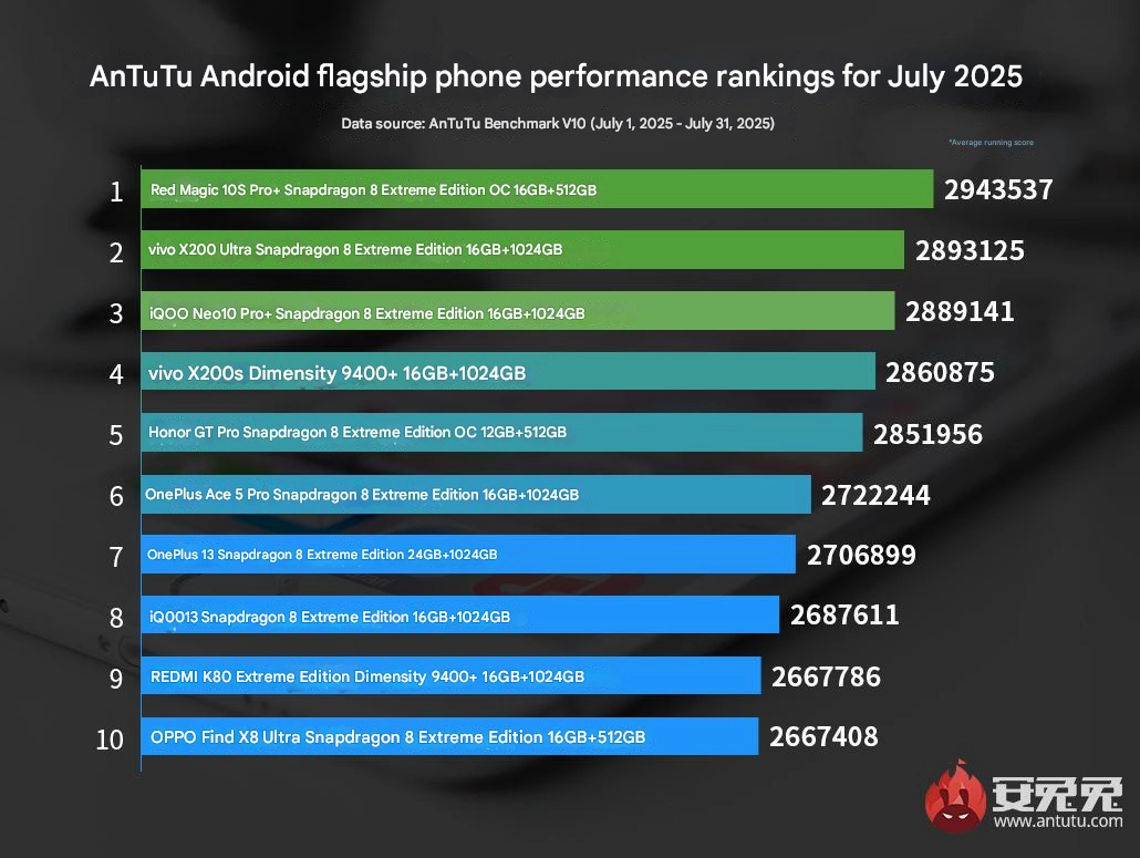 Обновился ежемесячный китайский рейтинг производительности смартфонов Antutu. Практически все обитатели топа-10 — флагманы на Snapdragon 8 Elite. Некоторые модели получили разогнанный вариант на 4,47 ГГц — такой, например, стоит во флагманской линейке Samsung.