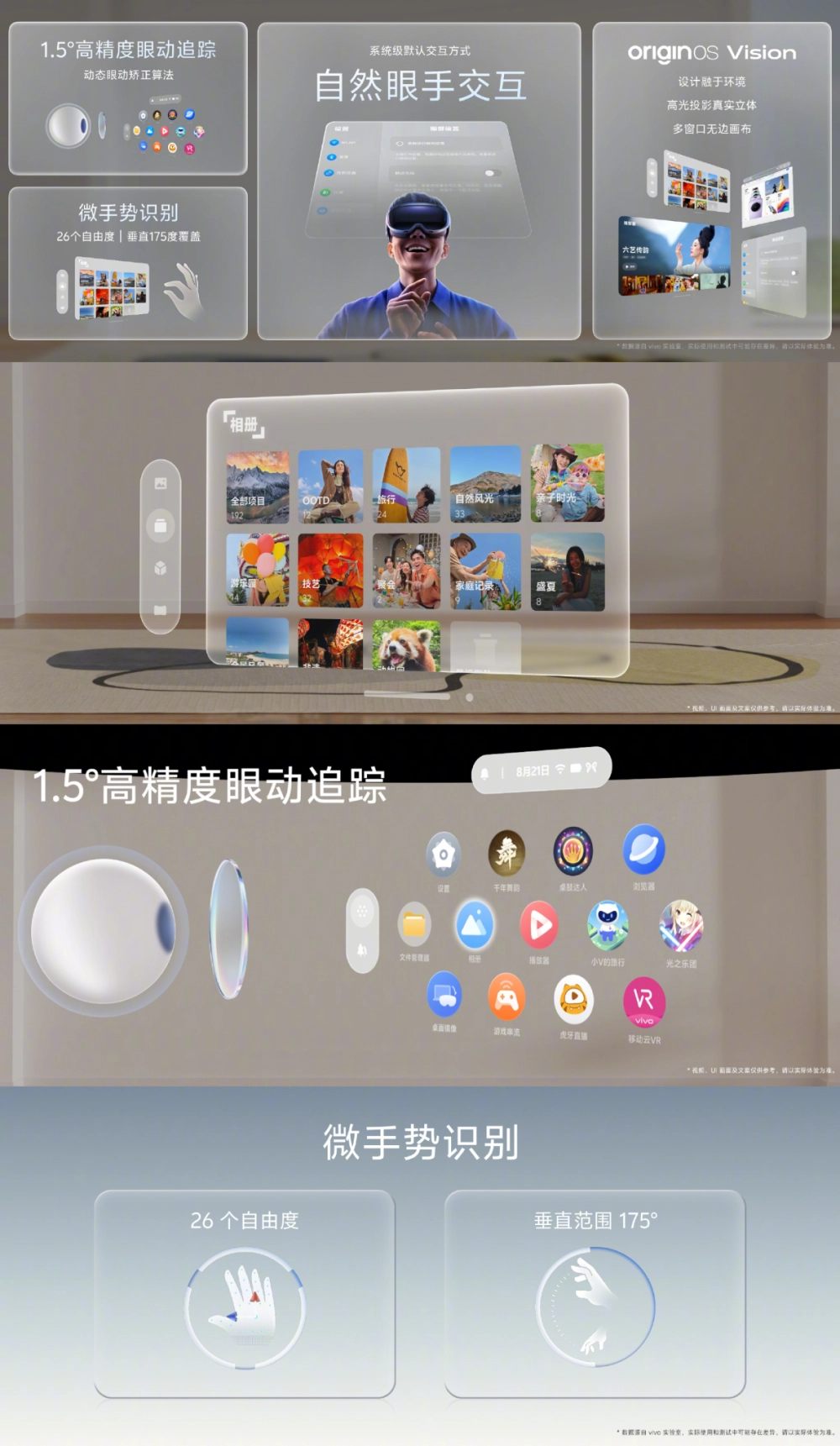 Гарнитура получила Micro-OLED дисплеи с разрешением 3840×3552 на каждый глаз, чипсет Snapdragon XR2+ Gen 2 и работает на базе системы OriginOS Vision, очень похожей на Apple VisionOS.