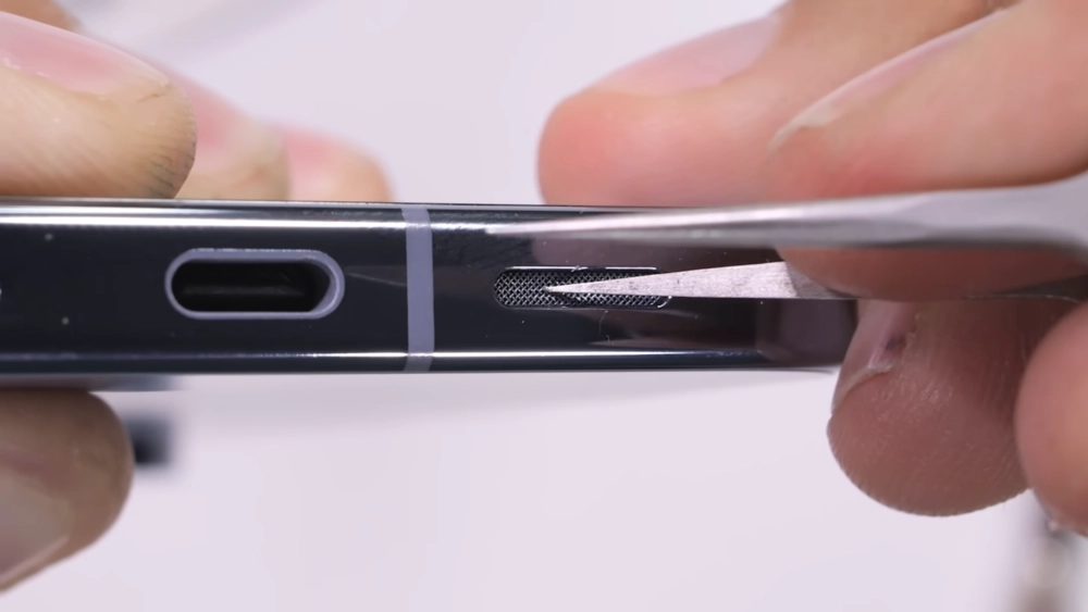 Далее блогер перешёл к боковым граням смартфона. Они царапаются обычным лезвием без дополнительных усилий. Нельсон также отметил, что защитная сетка динамиков на нижней грани не впечатляет — в неё будет забиваться мусор.