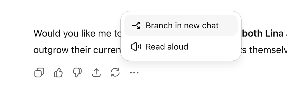 Создать новую ветку разговора можно по нажатии на кнопку «Ветка в новом чате» — она всплывает по нажатии на три точки в меню под ответом ChatGPT.