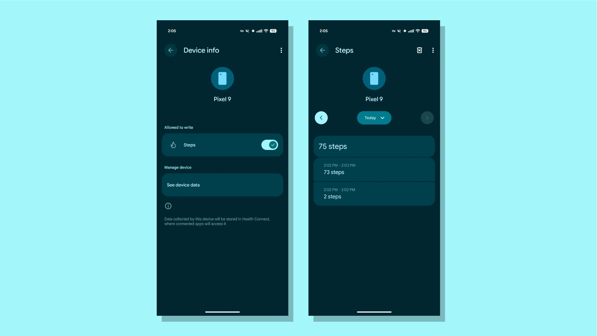Подсчёт шагов в Health Connect. Системный сервис для хранения данных о здоровье и физической активности научился подсчитывать шаги при помощи датчиков смартфона. Информацию могут получать сторонние приложения — например, сервис для подсчёта калорий, — если они получили на то разрешение пользователя.