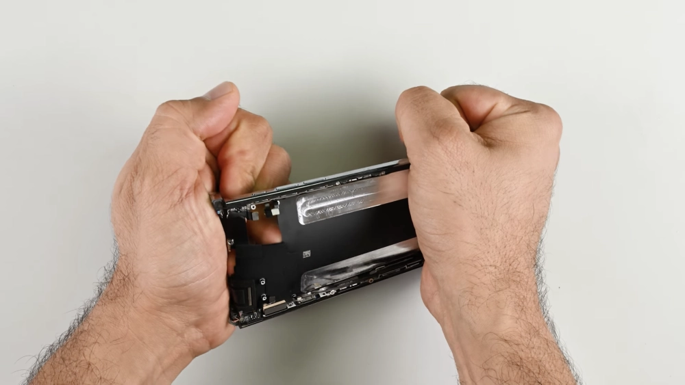 Погнуть iPhone Air в iFixit тоже попробовали — но не сам смартфон, а его титановую раму. Сама титановая рама не погнулась, но она «сдалась» в месте, где установлена пластиковая антенна: