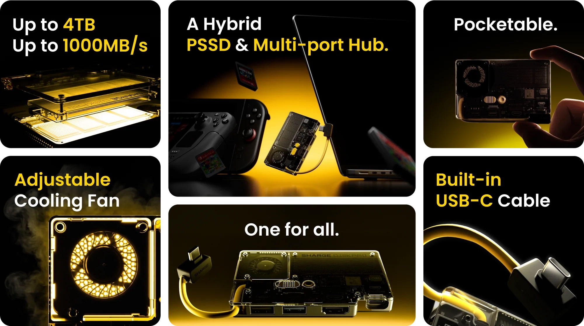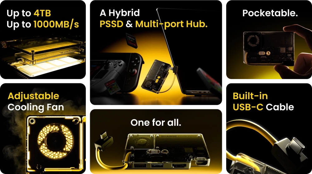 Disk Pro поддерживает скорости чтения и записи до 10 Гбит/с и может крепиться на магнит к смартфонам или консолям. В устройстве предусмотрен встроенный кабель USB-C, а также HDMI-порт с выводом до 4K/144 Гц или 8K/30 Гц. Дополнительно доступны USB-C и USB-A с общей мощностью до 80 Вт для зарядки подключённых гаджетов.