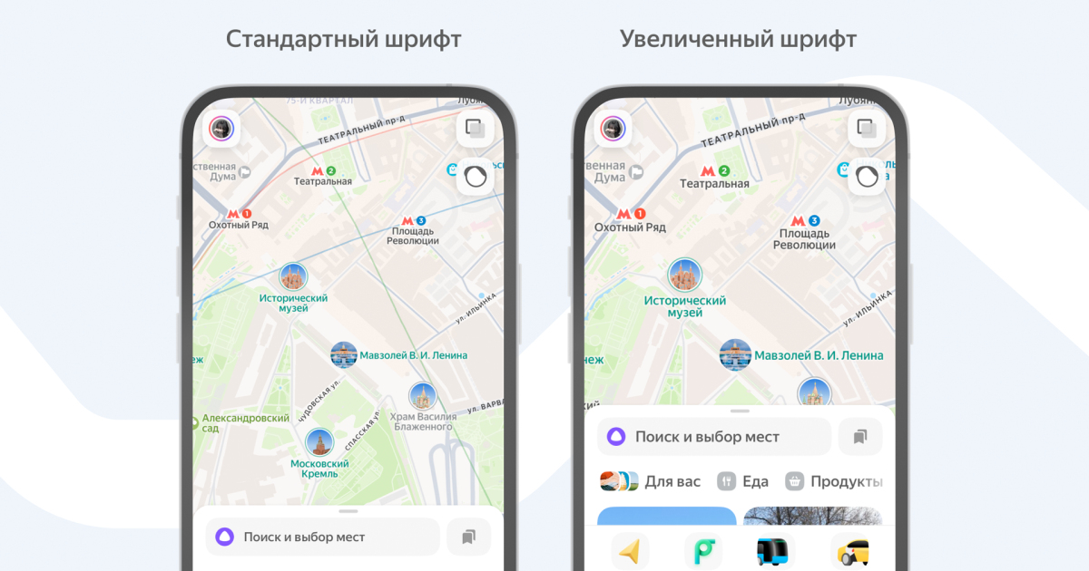 Теперь пользователи могут настраивать размер шрифта и иконок на карте. Он также меняется в зависимости от настроек смартфона пользователя — например, если на устройстве выбран увеличенный размер текста, надписи и иконки на карте тоже автоматически увеличатся.