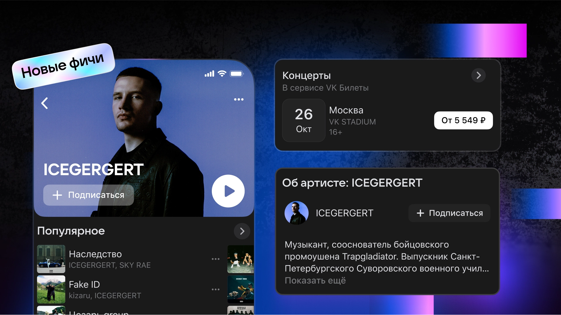 В новом блоке «Концерты» слушатели могут найти предстоящие выступления музыкантов, а также выбрать и купить билеты на концерты — благодаря интеграции в стриминг «VK Билетов». В сервисе можно также приобрести билеты на спектакли, выставки, кино и спортивные мероприятия.