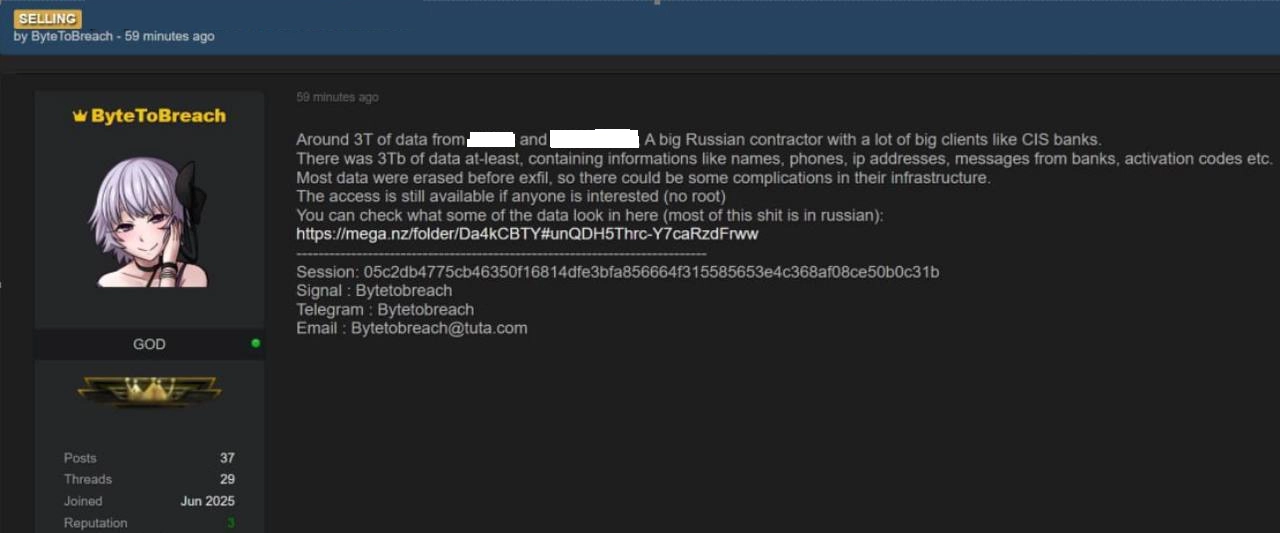 В даркнете появилось объявление о продаже «ключей от России» — 3 ТБ данных, которые, как утверждается, были похищены у двух крупнейших SMS-агрегаторов России. Автор объявления пишет, что в утечке содержатся имена, номера телефонов, IP-адреса, банковские сообщения, коды активации и другие данные.