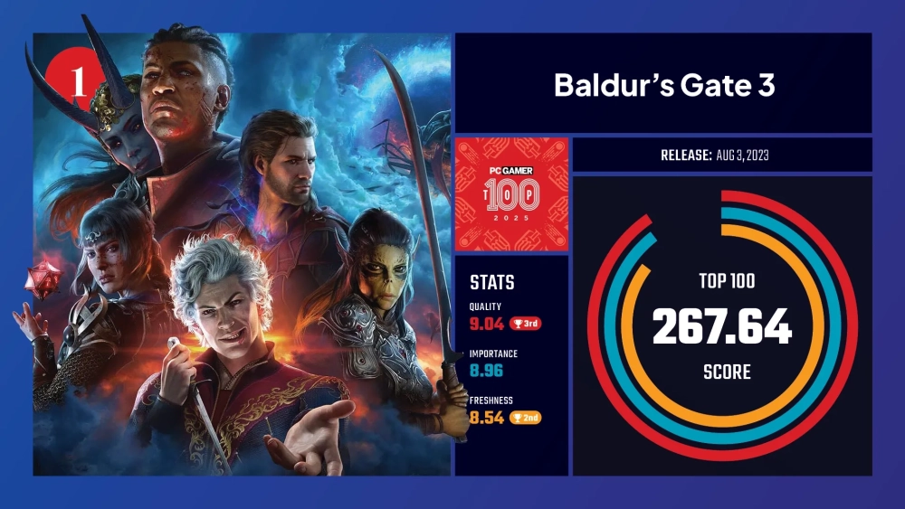 Издание PC Gamer опубликовало ежегодный рейтинг ста лучших игр для ПК, доступных на данный момент. Над выбором работали более тридцати редакторов и журналистов, которые несколько месяцев обсуждали и оценивали проекты по трём критериям: качеству (60%), значимости для индустрии (20%) и уникальности (20%).