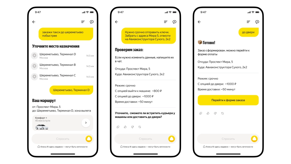 «Алиса AI» проанализирует запрос пользователя, определит, какой сервис поможет решить его задачу, и подключит нужного агента — «Такси», «Еды», «Лавки» или «Доставки». Перед оформлением заказа нейросеть предложит проверить все данные.