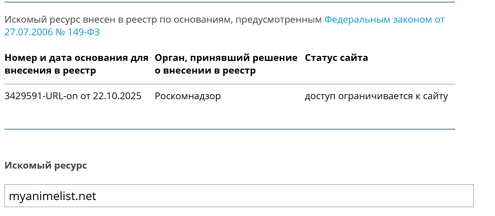 Из Единого реестра доменных имён стало известно, что Роскомнадзор заблокировал MyAnimeList — крупнейшую в мире платформу для поиска и оценки аниме и манги. Блокировка ресурса началась 22 октября.