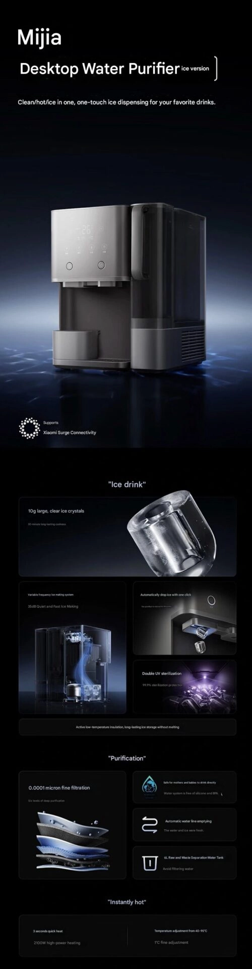 Xiaomi запустила льдогенератор с функцией очищения воды Mijia Desktop Water Purifier Ice Cream Edition. Устройство способно производить 10 грамм кубиков льда и нагревать воду до регулируемой температуры всего за 3 секунды.