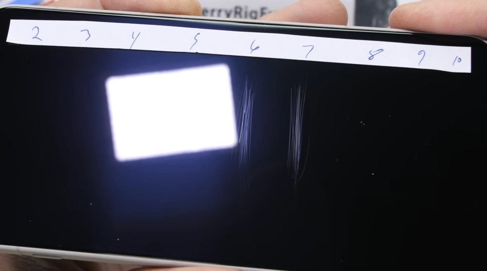 Первым делом JerryRigEverything проверил стекло дисплея Gorilla Glass Victus 2. Оно царапается на шестом и седьмом уровнях по шкале Мооса. Это не лучший результат среди актуальных флагманов.