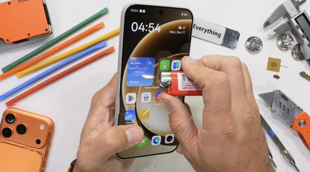 Ещё один стандартный тест для JerryRigEverything — воздействие пламени зажигалки на дисплей. OnePlus 15 успешно прошёл этот тест — огонь никак не повлиял на экран и не оставил дефектов.