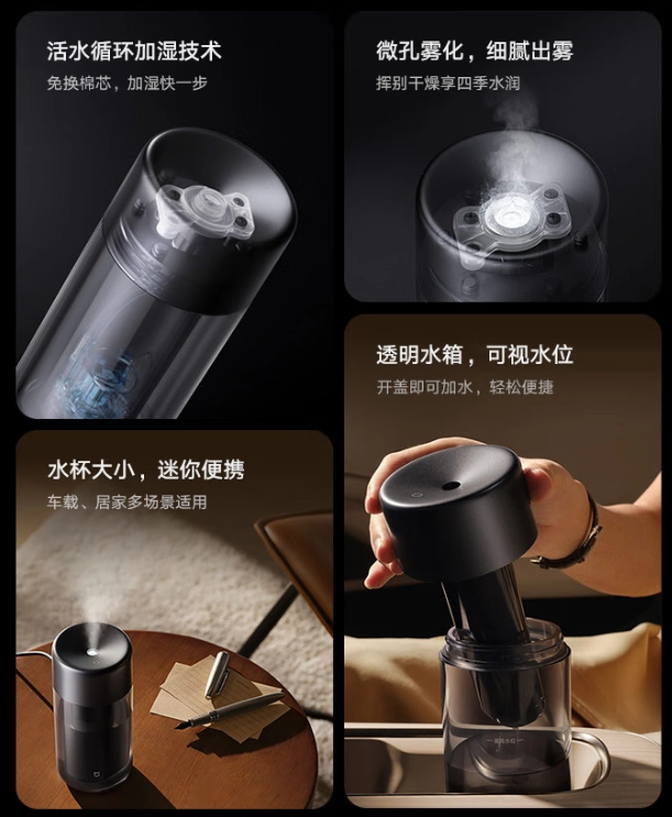 Увлажнитель весит 288 грамм и по габаритам подходит для большинства стандартных подстаканников. Xiaomi оснастила устройство прозрачным водяным баком с верхней заливкой и объёмом 210 мл.