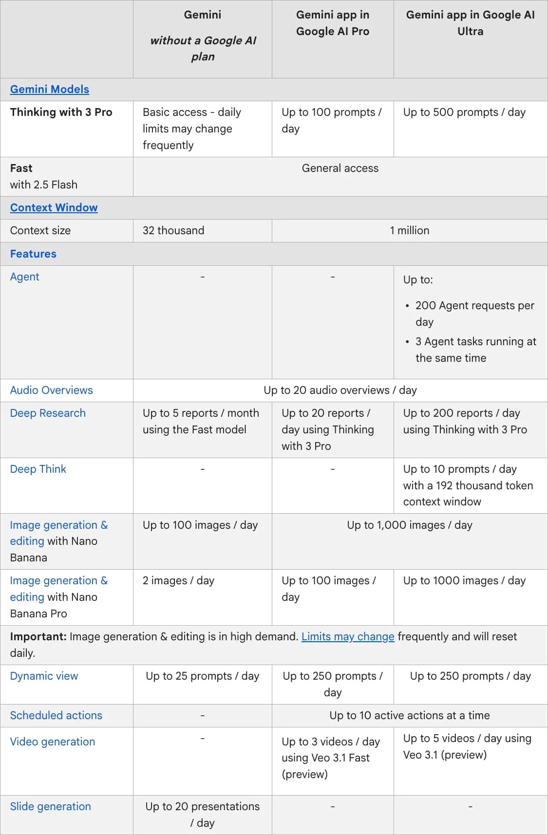 Несколько дней назад Google обновила ограничения, указав, что бесплатные пользователи будут иметь «базовый доступ» к модели 3 Pro, где «ежедневные лимиты могут часто меняться». Учитывая, что ранее такой формулировки не было, вероятно, лимит изменился в сторону снижения. Также вместо трёх картинок от Nano Banana Pro теперь в день можно сделать всего две.