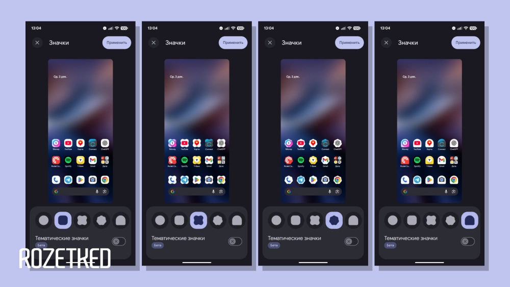 - Система получила новые настройки персонализации: вернулся выбор формы иконок, а тематический стиль Material You теперь автоматически применяется ко всем значкам приложений, даже если разработчик не создал специальную версию.