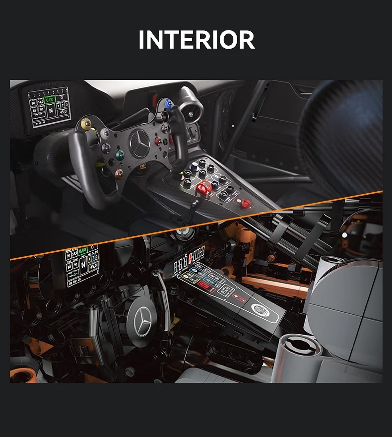 Набор состоит из 5466 деталей, а габариты собранной машины составляют 59×25×17 см. Внутри установлены детализированный мотор, шестиступенчатая коробка передач и функциональное рулевое управление. Помимо этого, модель оснащена регулируемым антикрылом и открывающимся капотом.