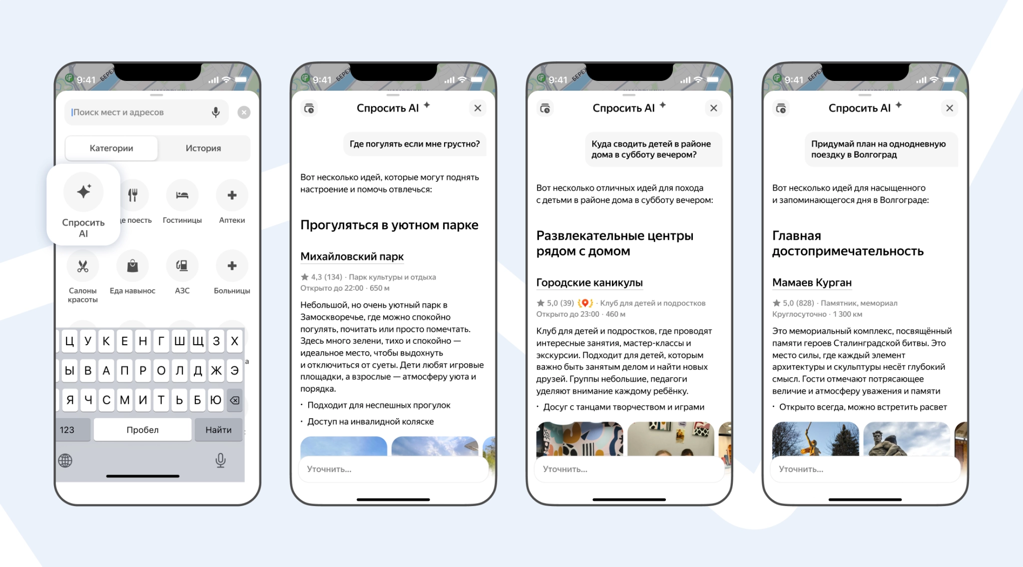 «С помощью ИИ можно общаться с „Картами“: спрашивать, чем заняться в городе, получать подборки и обзоры различных мест или даже просить спланировать день в поездке. ИИ сфокусирован на планировании досуга и поможет в задачах, в которых недостаточно одного поискового запроса»— пресс-служба «Яндекса»
