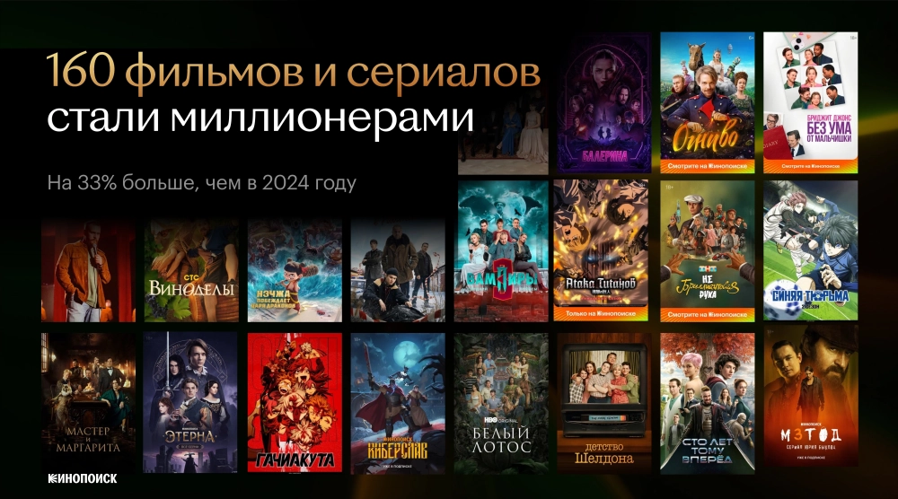 Помимо этого, 160 фильмов и сериалов в онлайн-кинотеатре достигли аудитории в 1 млн подписчиков. По сравнению с прошлым годом количество тайтлов-миллионеров выросло на 33%.