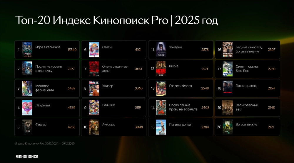 В команде «Кинопоиска» подвели итоги 2025 года — собрали топ-20 самых популярных проектов, а также поделились другой статистикой за год. Подробностями с Rozetked поделились в пресс-службе компании.