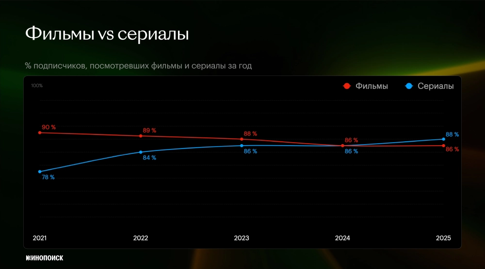 - Российский контент на «Кинопоиске» в 2025 году посмотрели 88% аудитории: большую часть смотрения обеспечивают российские сериалы, их смотрели 81% аудитории.