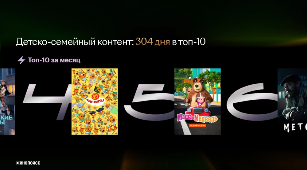 Отдельно в компании отмечают мультсериал «Маша и Медведь», который в этом году превысил отметку в 10 млн смотрящих подписчиков и стал новым лидером по аудитории за всю историю «Кинопоиска», опередив «Триггер».