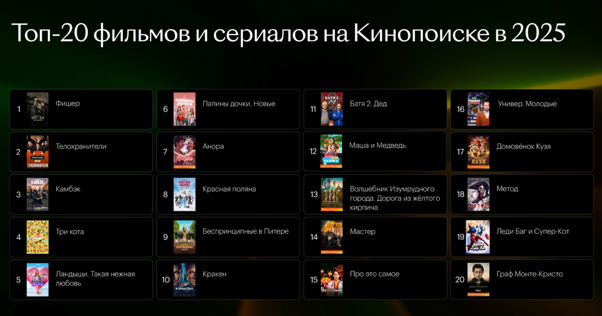 Самым популярным проектом 2025 года на «Кинопоиске» стал детективный триллер «Фишер». Далее в топе расположились комедия «Телохранители» драма «Камбэк», мультфильм «Три кота» и мелодрама «Ландыши». Тем временем самым популярным фильмом года стала «Анора».
