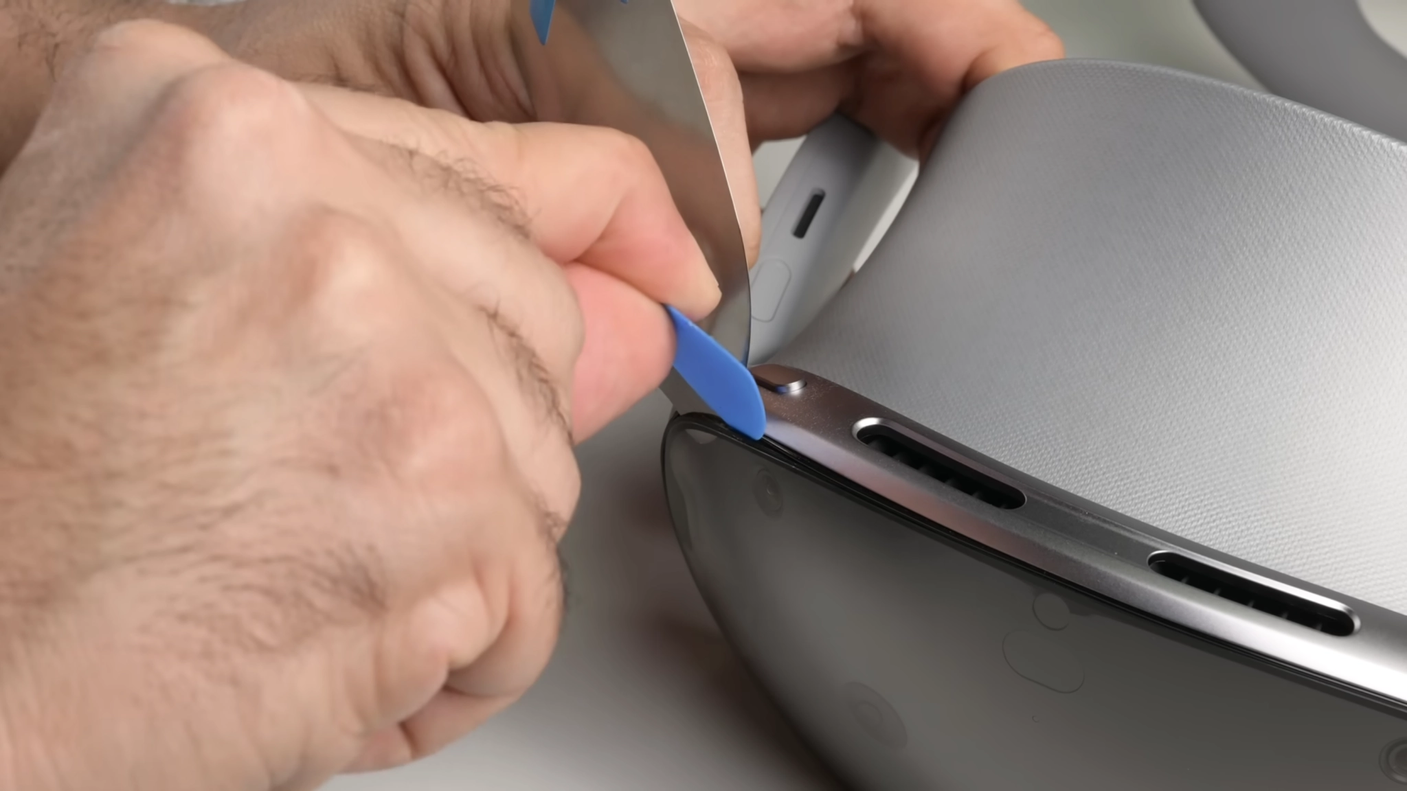 Чтобы попасть внутрь Galaxy XR, сначала нужно снять лицевую панель — которых, как оказалось, две, а не одна. Снимаются лицевые панели просто: нужно нагреть пластик и поддеть его медиатором.