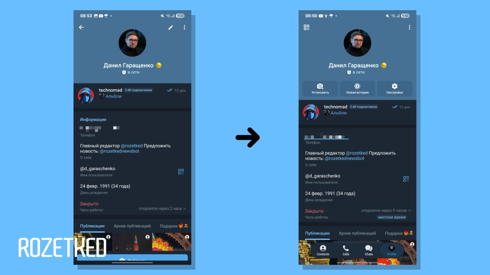 - Новый внешний вид профиля с кнопками для быстрых действий.