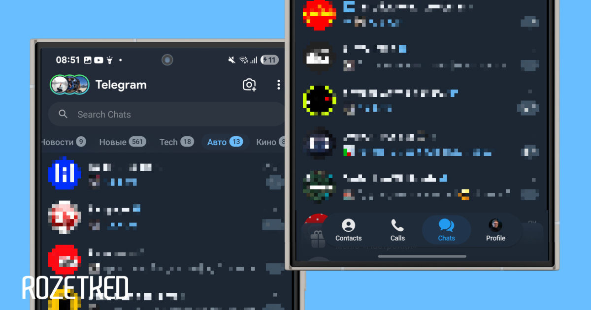 Команда Telegram выпустила тестовую сборку приложения для Android под номером 12.3.0. Она привносит полностью новый интерфейс — с нижним меню вместо боковой панели.