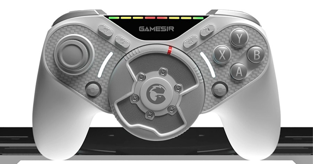 Компания GameSir, известная своими необычными геймпадами — например, Tarantula Pro, который меняет надписи на кнопках под разные раскладки — анонсировала геймпад с миниатюрным рулевым колесом на лицевой панели.