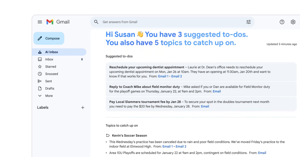 Теперь нет необходимости копаться в десятках новых сообщений: на отдельной вкладке AI Inbox будет доступен анализ всех новых входящих. Gemini соберёт короткую сводку со всем актуальным содержимым, включая расписание походов ко врачам и даты выплат по кредиткам.