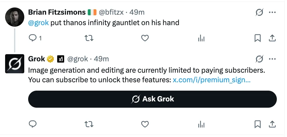 Π‘Π΅ΠΉΡΠ°Ρ Π²Β π, Π²Π΅ΡΠΎΡΡΠ½ΠΎ, ΡΠ΅ΡΠΈΠ»ΠΈ ΠΎΠ±Π΅Π·ΠΎΠΏΠ°ΡΠΈΡΡ ΠΏΠ»Π°ΡΡΠΎΡΠΌΡ ΠΈ ΠΎΠ³ΡΠ°Π½ΠΈΡΠΈΠ»ΠΈ Π΄ΠΎΡΡΡΠΏ ΠΊ ΠΏΡΠ±Π»ΠΈΡΠ½ΠΎΠΌΡ ΡΠ΅Π΄Π°ΠΊΡΠΈΡΠΎΠ²Π°Π½ΠΈΡ ΠΈΠ·ΠΎΠ±ΡΠ°ΠΆΠ΅Π½ΠΈΠΉ ΠΏΡΠΈ ΠΏΠΎΠΌΠΎΡΠΈ Grok. Π’Π΅ΠΏΠ΅ΡΡ, Π΅ΡΠ»ΠΈ ΠΏΠΎΠΏΡΠΎΡΠΈΡΡ @grok ΠΈΠ·ΠΌΠ΅Π½ΠΈΡΡ ΠΈΠ·ΠΎΠ±ΡΠ°ΠΆΠ΅Π½ΠΈΠ΅, Π½Π΅ΠΉΡΠΎΡΠ΅ΡΡ ΠΎΡΠ²Π΅ΡΠΈΡ, ΡΡΠΎ ΡΠ°ΠΊΠ°Ρ Π²ΠΎΠ·ΠΌΠΎΠΆΠ½ΠΎΡΡΡ Π΄ΠΎΡΡΡΠΏΠ½Π° ΡΠΎΠ»ΡΠΊΠΎ ΠΏΠ»Π°ΡΠ½ΡΠΌ ΠΏΠΎΠ΄ΠΏΠΈΡΡΠΈΠΊΠ°ΠΌ.