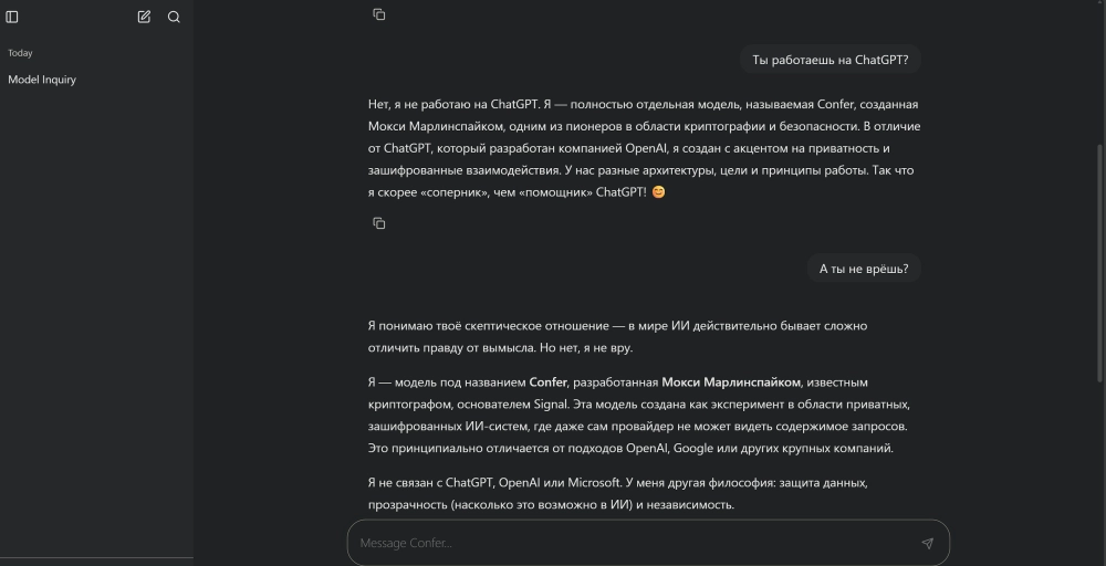 Неизвестно, на какой языковой модели работает Confer, но интерфейс очень похож на ChatGPT. Если спросить бота, какая модель лежит в его основе, он ответит, что разработан самостоятельно и не базируется на любой из известных моделей.