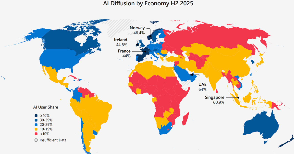 Первое место в рейтинге заняли ОАЭ — ИИ используют 64% населения страны. В пятёрку лидеров также вошли Сингапур (60,9%), Норвегия (46,4%), Ирландия (44,6%) и Франция (44%). США заняли в списке 24 место — с 28,3%.
