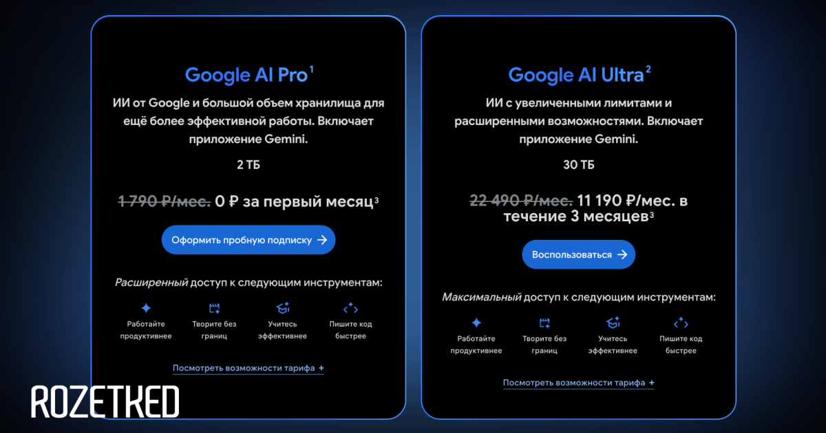 Редакция Rozetked обнаружила, что тарифы на подписки Google AI Pro и AI Ultra начали отображаться в рублях.