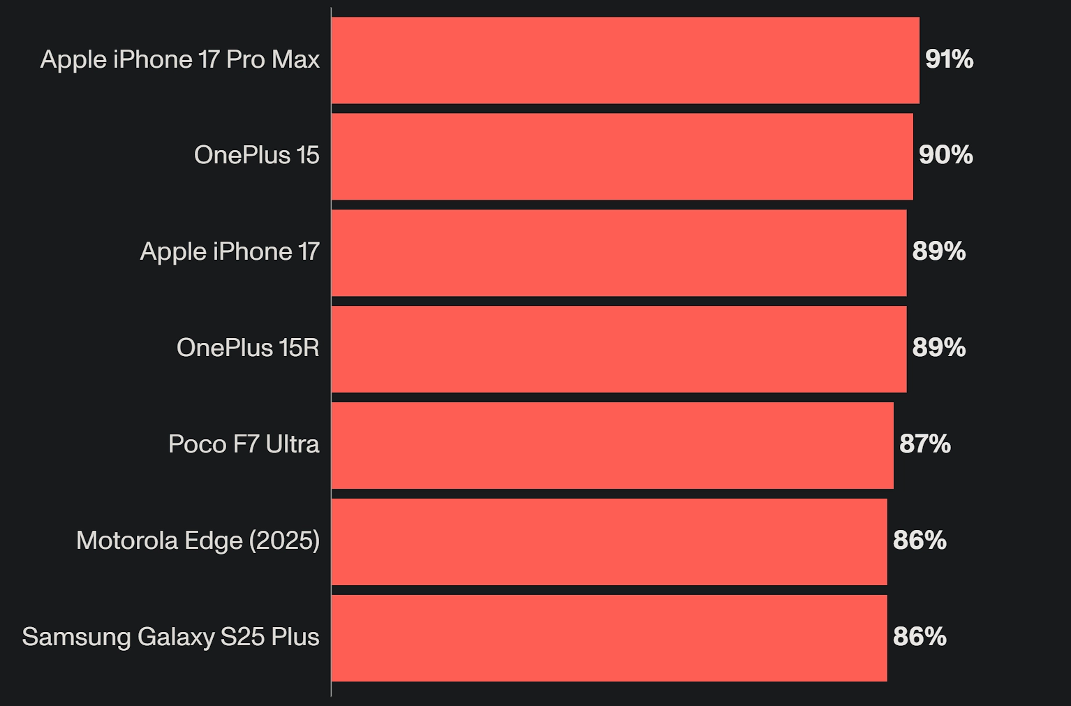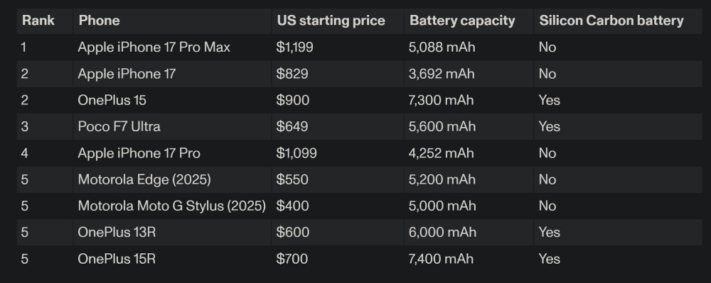 Следом за iPhone в рейтинге расположился OnePlus 15 с кремниево-углеродной батареей ёмкостью 7300 мАч. Также в рейтинге нашлось место бюджетным смартфонам Motorola с относительно небольшими батареями на 5000 и 5200 мАч. Их успехи можно объяснить не слишком мощным и экономичным железом.