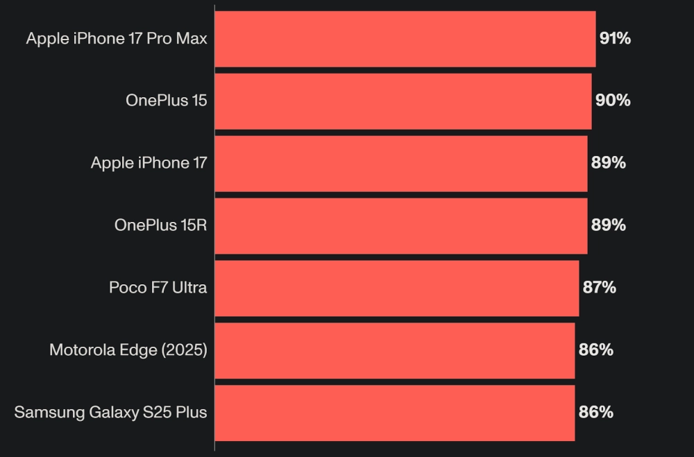 Также издание поделилось результами нескольких тестов, одним из которых стало 3-часовое проигрывание видео. С этим результатом лучше всего справился iPhone 17 Pro Max, потеряв за 3 часа лишь 9% зарядки. Последнее место в рейтинге занял Samsung Galaxy S25 Plus — после теста у него осталось 86% батареи.