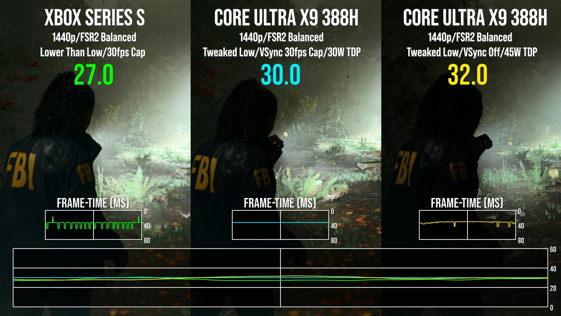 Автор подобрал максимально схожие (низкие) настройки графики на ПК со «встройкой» Intel и использовал AMD FSR 2 в режиме «баланс», чтобы добиться стабильных 30 кадров в 1440р.