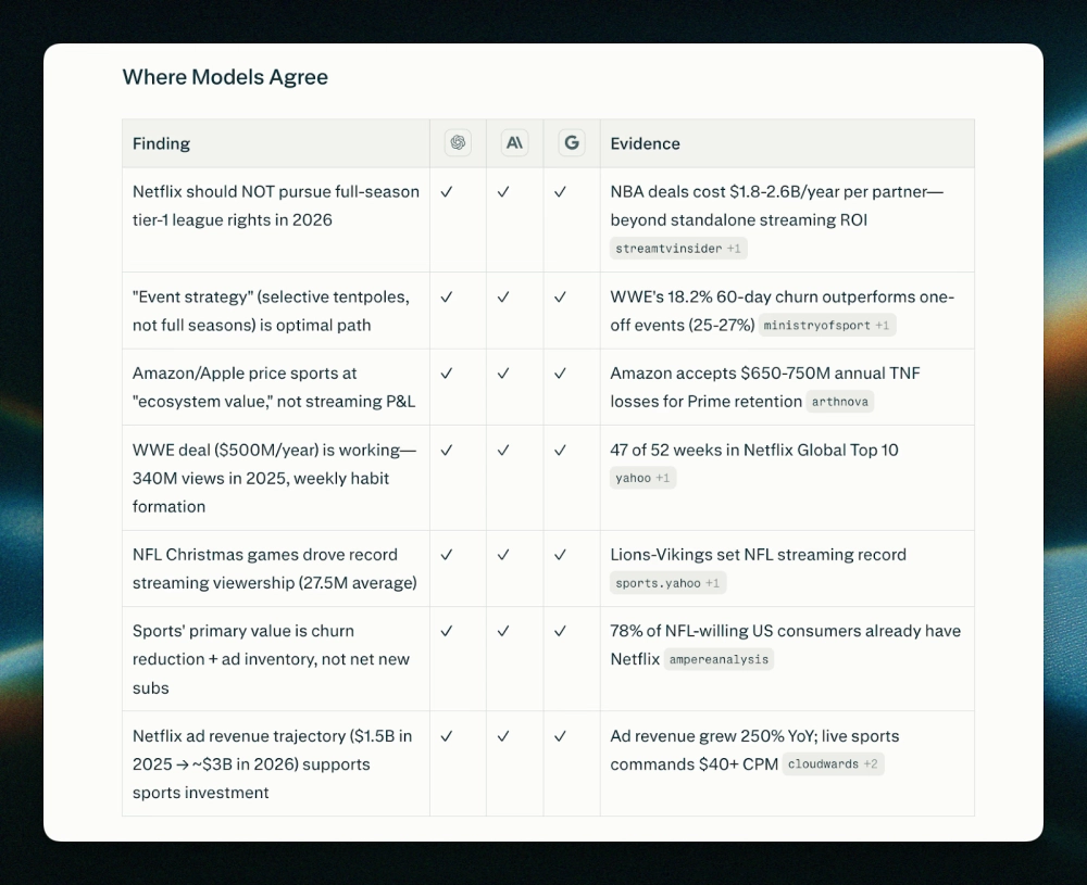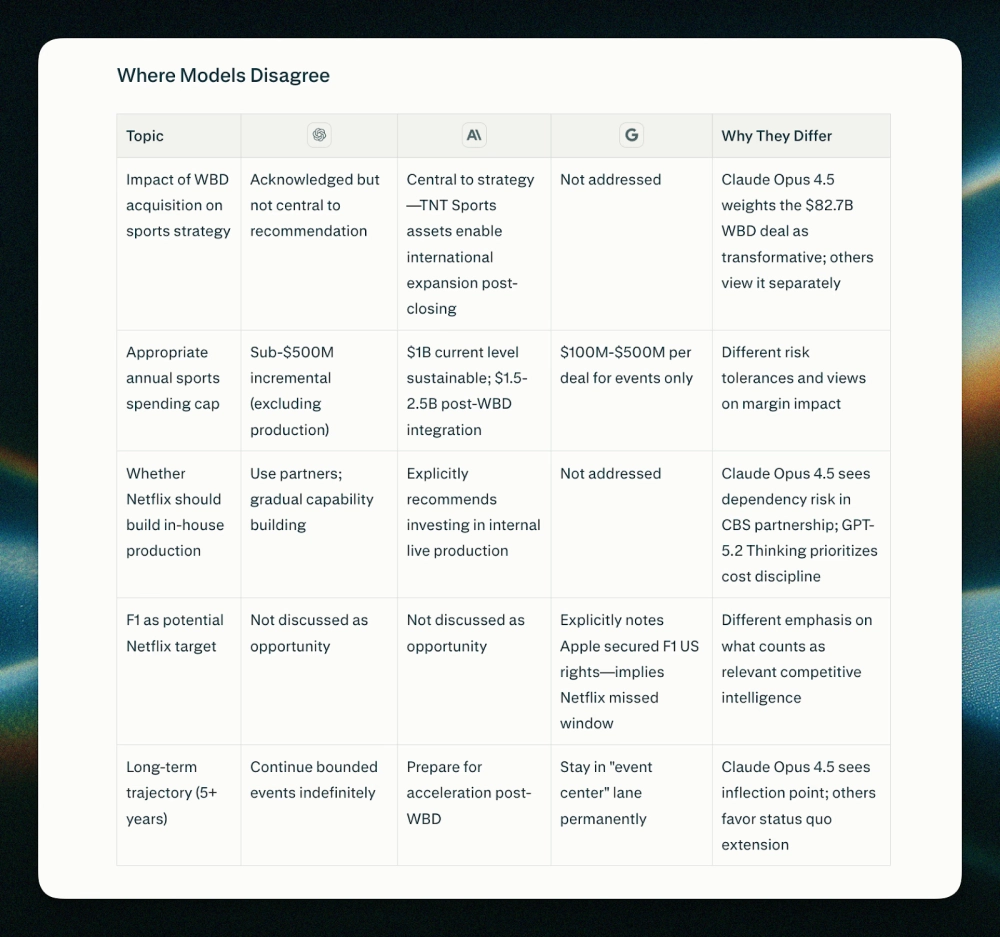 В интерфейсе Model Council запрос обрабатывается сразу тремя передовыми моделями (например, Claude Opus 4.6, GPT 5.2 и Gemini 3.0). Специальная модель-синтезатор анализирует их выводы, разрешает конфликты и формирует единый ответ. Прямо в выдаче можно увидеть, где нейросети пришли к консенсусу, а где их данные или мнения разошлись.