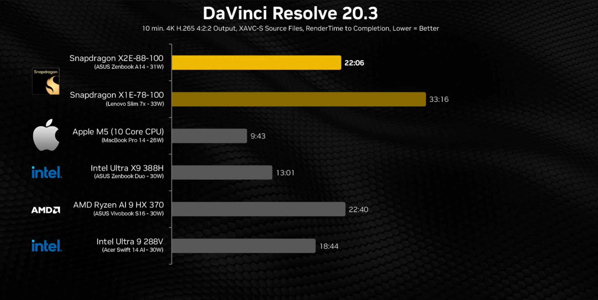 При этом в других тестах Snapdragon X2 Elite, напротив, полностью провалился: в тесте DaVinci Resolve чипсет показал наихудшие результаты, уступив всем конкурирующим решениям — в этот раз первенство взял Apple M5: