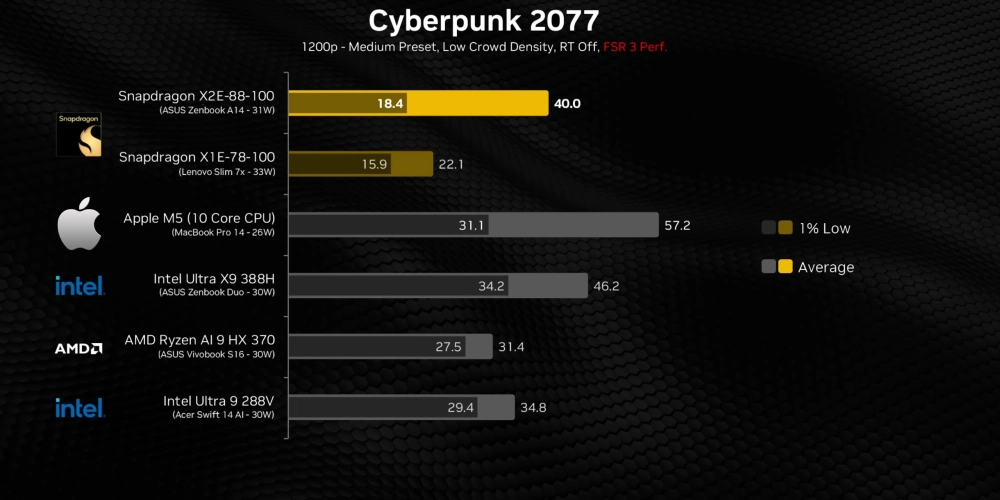 Здесь, что удивительно, лучшие результаты показал Apple M5: средний показатель fps составил 57 кадров в секунду, что больше, чем у решений Intel и AMD. Чипсет от Qualcomm почти удвоил производительность по сравнению с предшественником и выдал около 40 кадров в секунду, что превышает показатели некоторых моделей с AMD и Intel на борту.