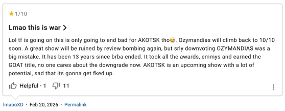 В ответ на это фанаты «Рыцаря Семи королевств» начали таким же образом занижать оценки серий Breaking Bad — в частности оценки «Озимандии».