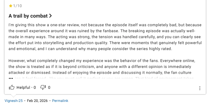 Суть в том, что недавно вышла пятая серия «Рыцаря Семи королевств», которую очень хорошо встретили зрители, и её рейтинг на IMDb приближался к «десятке». Некоторые фанаты «Во все тяжкие» решили устроить ревью-бомбинг и занизить оценку спин-оффа «Игры престолов».