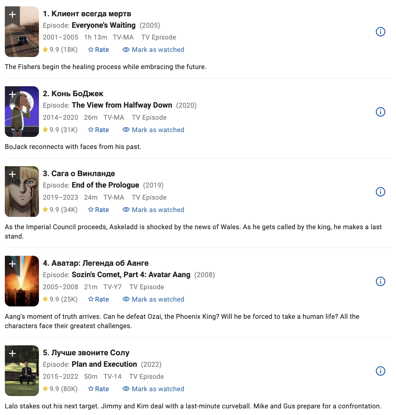 Сначала это привело к тому, что «Озимандия», одна из финальных серий «Во все тяжкие», лишилась идеальной оценки на IMDb. Теперь же рейтинг эпизода упал ещё ниже — и серия выбыла из топ-100 самых высокооценённых серий на IMDb, где раньше лидировала.