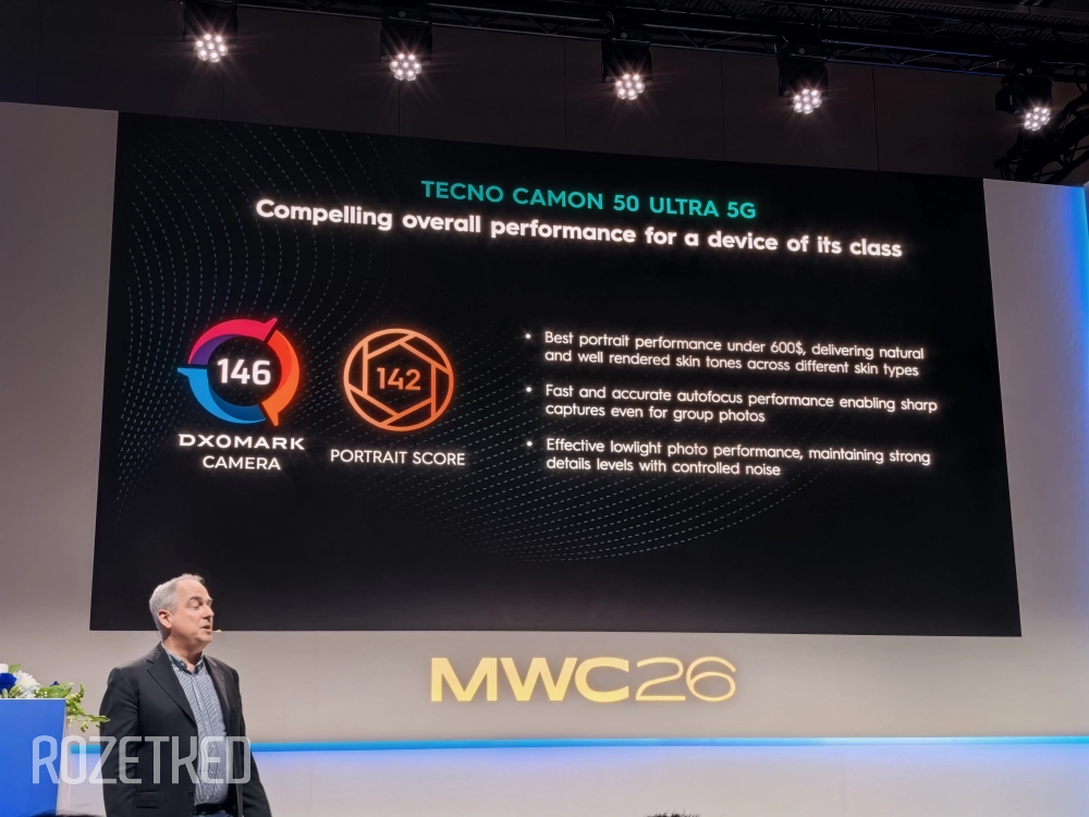 Tecno провела свою основную презентацию на MWC 2026 в Барселоне — редакция Rozetked побывала на мероприятии. Главным анонсом стала серия среднебюджетных смартфонов Camon 50 с упором на мобильную съёмку.