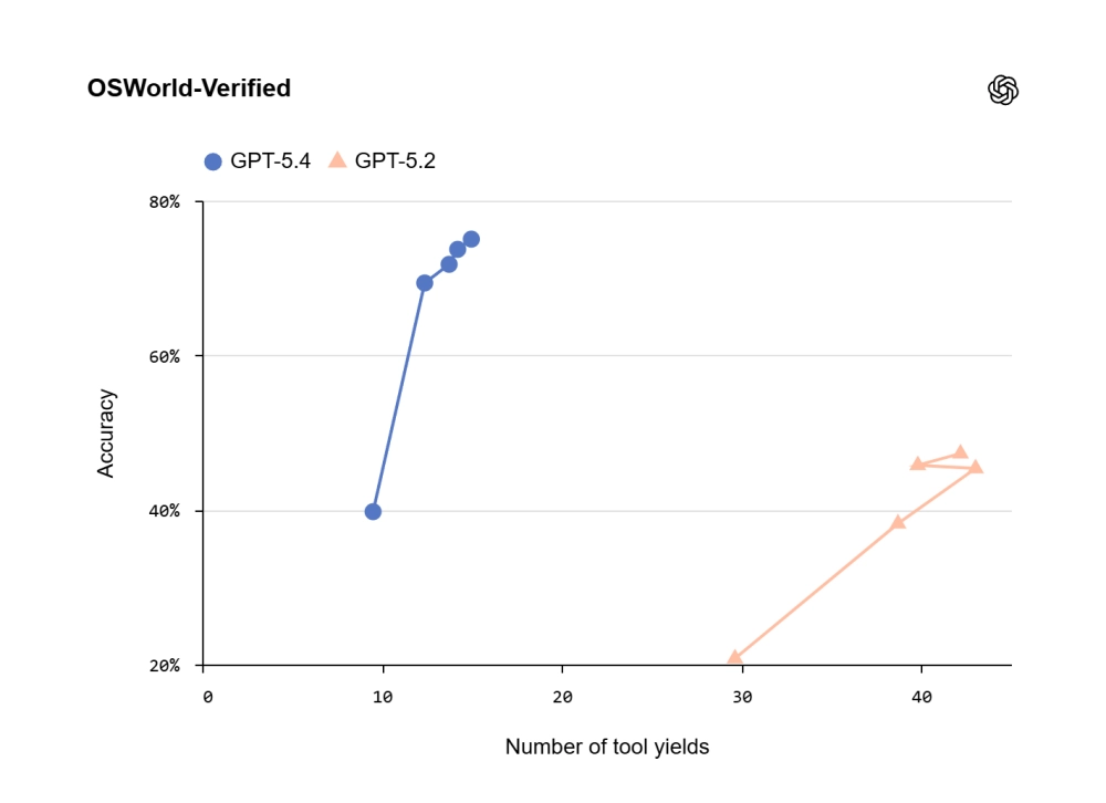 GPT-5.4 стала первой ИИ-моделью компании с нативной функцией использования компьютера. В бенчмарке OSWorld-Verified она показала успешность в 75%, значительно превзойдя прошлую версию GPT-5.2 (47,3%) и средний результат человека (72,4%), требуя при этом меньшего количества шагов для выполнения задач.