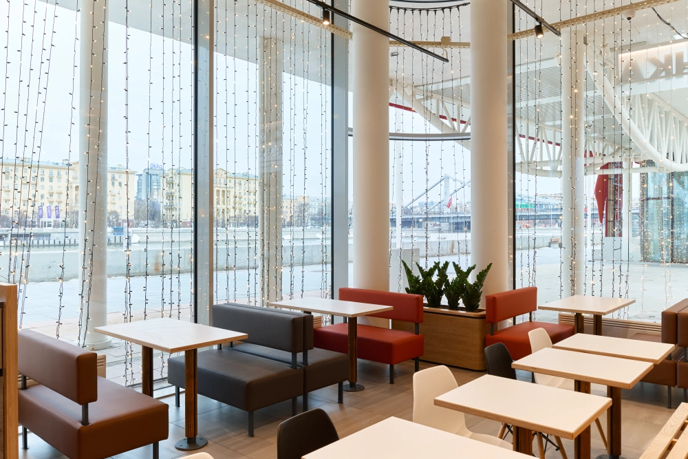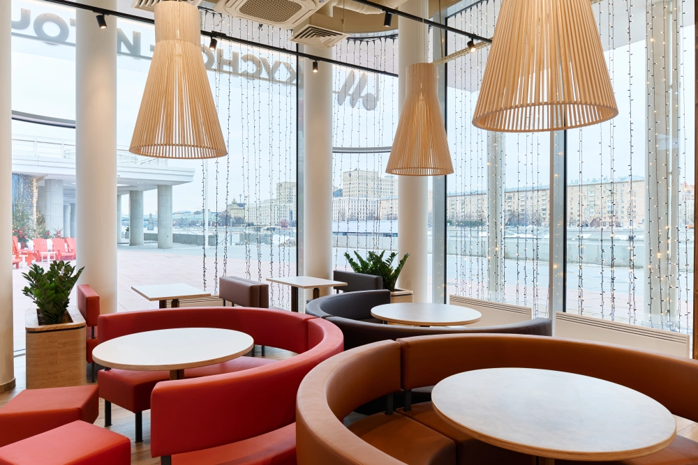 Ресторан фаст-фуда с декором из натурального дерева и бетона расположен напротив причала «Парк Горького-1», в одном из павильонов с панорамным остеклением на площади 689 м².